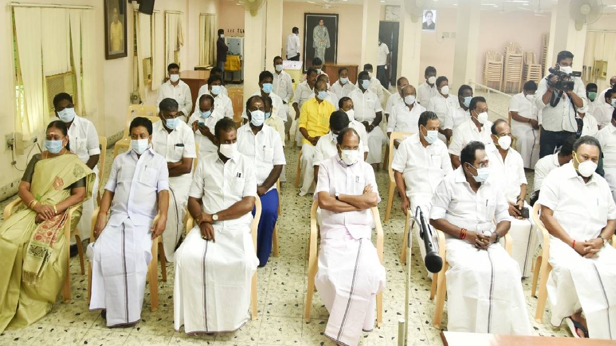The discussion was held in Chennai in the presence of Edappadi Karuppa Palaniswami and O Panneerselvam, along with the ministers and district secretaries of the AIADMK party.