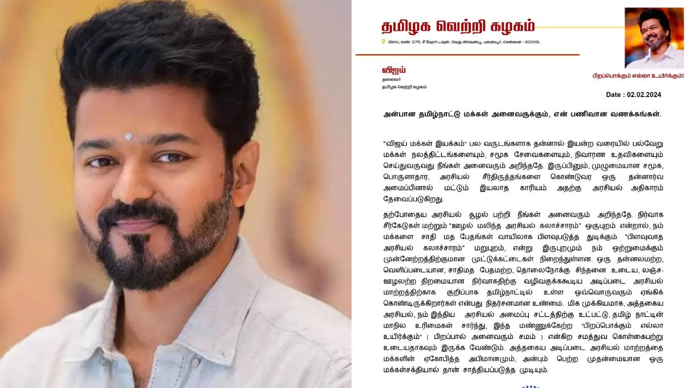 As announced earlier, actor Thalapathy Vijay has entered politics and named the party 'Tamizhaga Vetri Kazhagam'. He has also released an official statement in this regard.