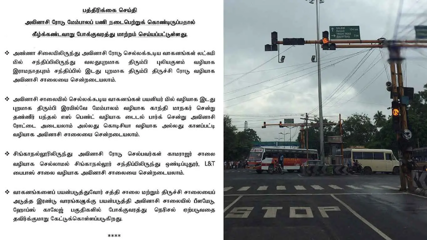 As the construction work on the Avinashi Road flyovers continues, the diversion of traffic is essential, and the following are the new routes that have been designated to accommodate the redirection of vehicles.